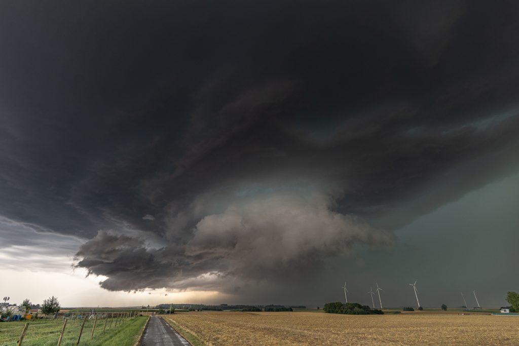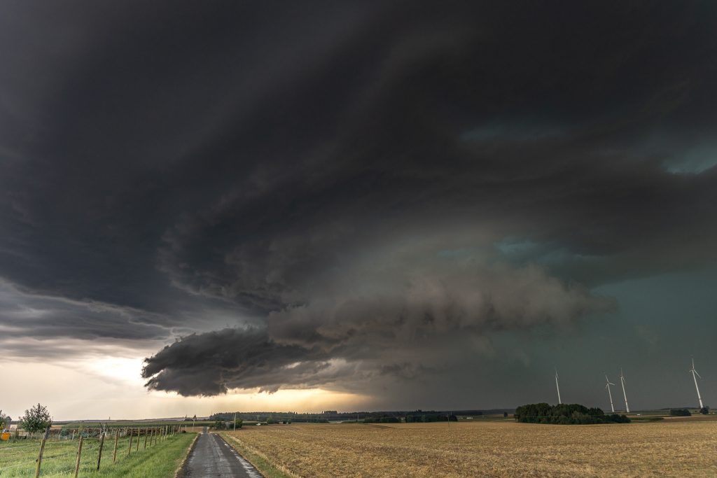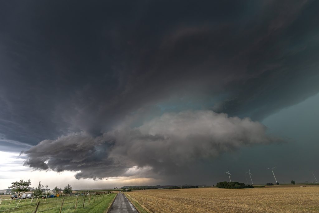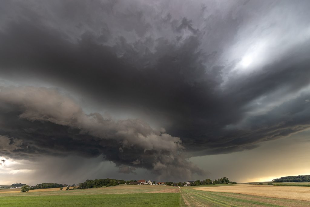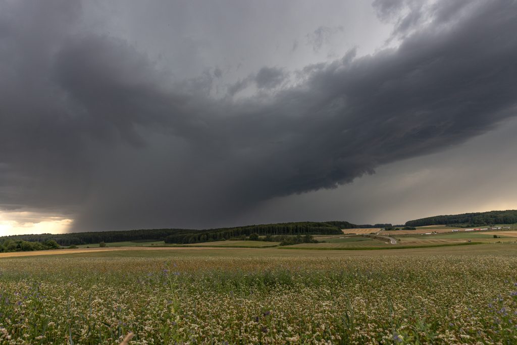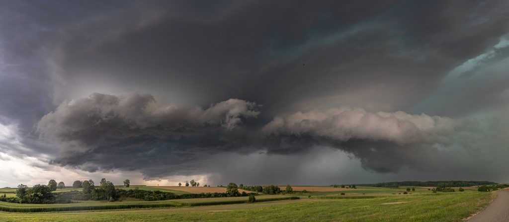 Am nächsten Standort bei Dornstadt stand ich dann vor einem extrem fotogenen eingedrehten Aufwindbereich an dem sich eine tiefe Wallcloud ausbildete. Dazu der nun intensiv grün leuchtende Niederschlagskern und ein lautes Rauschen, welches 1km entfernt durch fallenden Hagel gepaart mit Sturmböen verursacht wurde. Hier entstand gerade eine Superzelle.