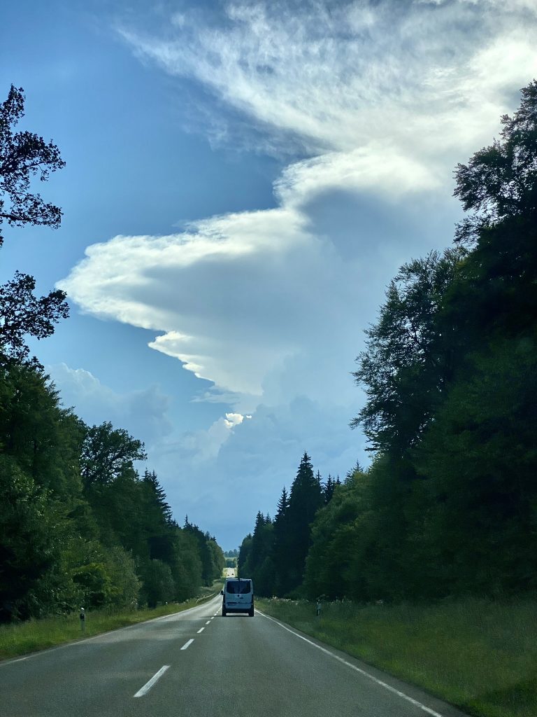 Der Aufwindbereich wurde immer deutlicher sichtbar, wobei zunächst die Strukturen eher langweilig daher kamen. Bei einem ersten Halt bei Scharenstetten stand ich fast direkt vor dem sich gerade verstärkenden Niederschlagskern über Geislingen an der Steige. Optisch schien es jedoch so, als würde der Niederschlag mehr und mehr die Aufwindteile verschlucken. Ein klassischer Vorgang wenn die fehlende Eigendynamik einer Zelle verhindert, dass Auf- und Abwind klar voneinander getrennt bleiben. Eine Sache sprach allerdings ganz klar gegen eine abschwächende Tendenz der Zelle. Es war zunehmend ein lautes Dauergrummeln zu hören und etliche Blitze im Kern. Der Aufwind durch den diese Zelle nun versorgt wurde musste also außerhalb meines aktuellen Sichtfeldes sein.