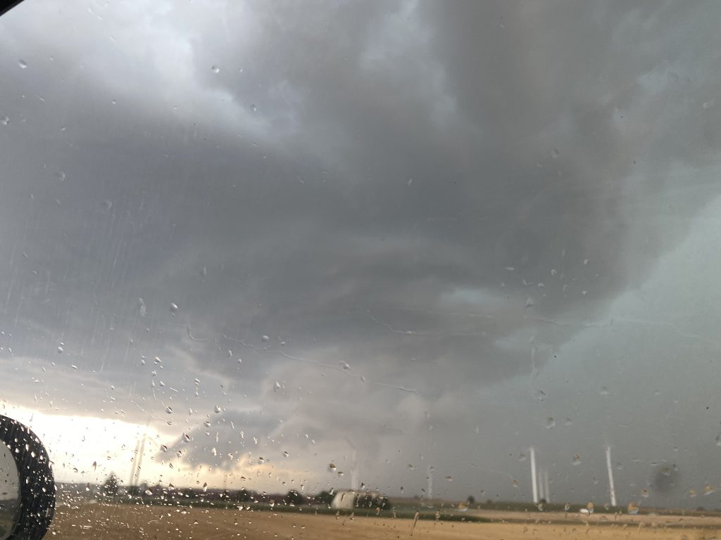 Bei Langenau an der A7 wurde die Wallcloud schon wieder etwas zerrupft, aber der Aufwind war immer noch sehr fotogen und besonders im rechten oberen Bereich bildeten sich mehrere beeindruckende Inflowtails aus. Kurz nach diesem Zeitpunkt erreichte die Superzelle ihren Höhepunkt und produzierte Hagel kurzzeitig bis 3cm.
