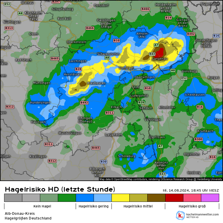 Nach diesem Zeitpunkt begann die Zelle in eine Linie mit Neuauslösen südlich davon überzugehen. Dennoch waren die Strukturen bei Gundelfingen an der Donau nochmals sehr spektakulär.