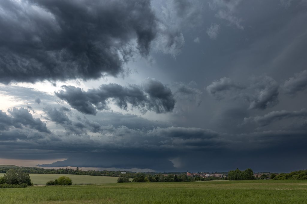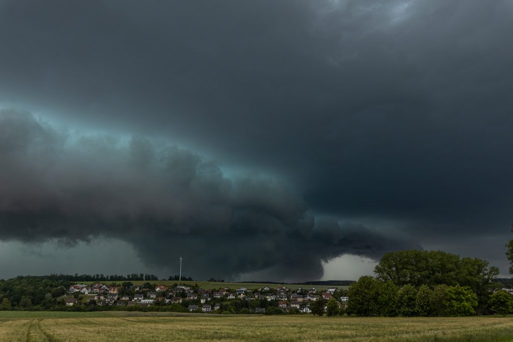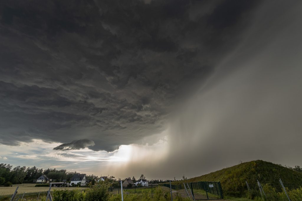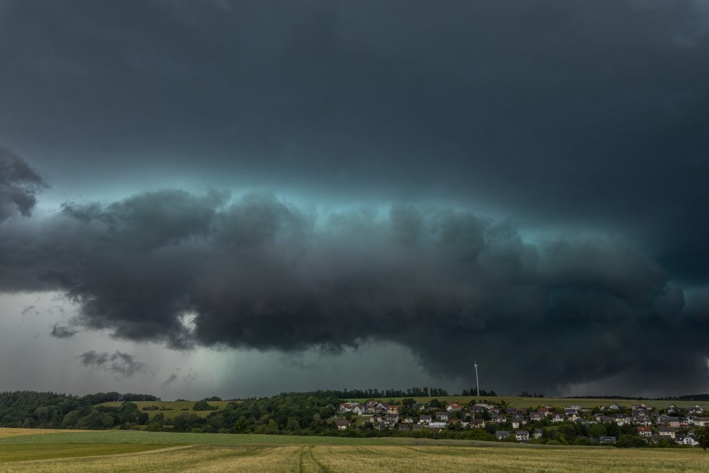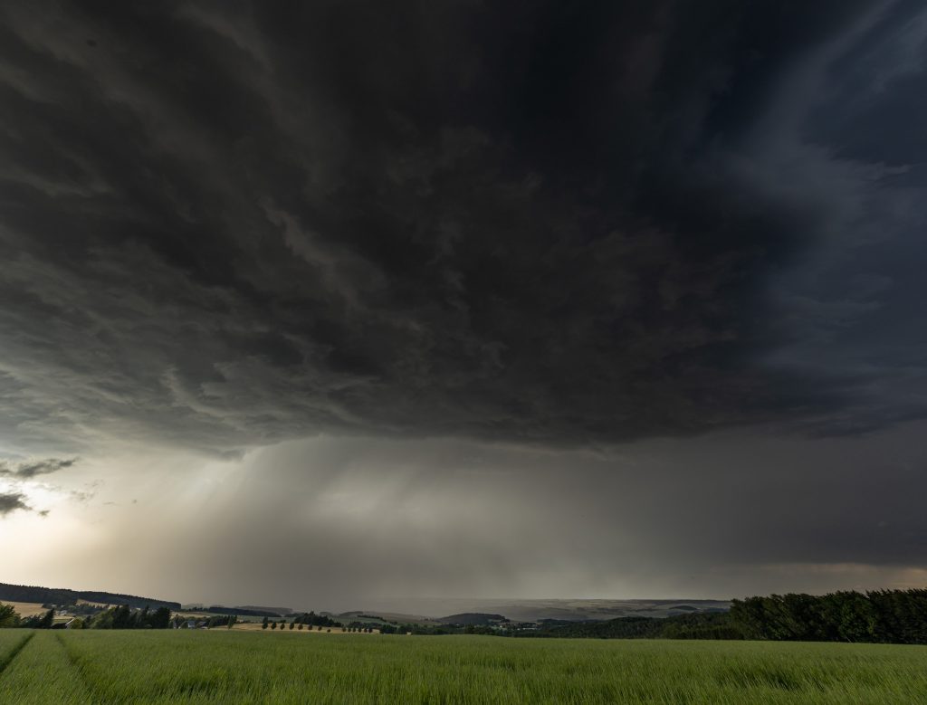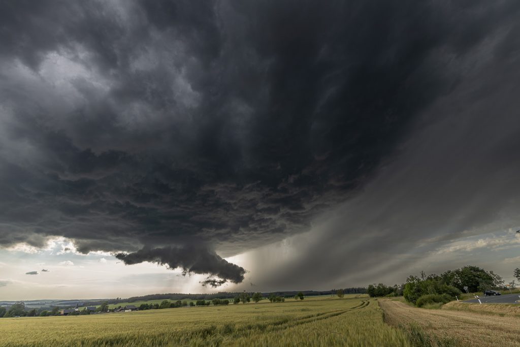 Nach diesen Aufnahmen ging es schnell weiter zurück auf die Autobahn und Richtung Osten. Beim Erreichen der Autobahn war die Böenfront schon über mir und man sah, wie der Niederschlagskern die hügeligen Wälder hinter mir bereits verschluckt hatte. Auf dem Weg nach Eisenach gab es vorweg überall Neuauslöse und es begann flächig zu regnen. Deshalb machte ich mir zu diesem Zeitpunkt keine Hoffnungen mehr, dass sich diese Zelle auf ihrem Weg in die Richtung der Neuauslöse noch weiter durchsetzen kann. Bis Erfurt stand ich dann wieder im Trockenen und hatte, wie fast schon zu erwarten, eine eher unstrukturierte Linie, die am Auslaufen war. Bei meinen Teamkollegen die in Nordsachsen verteilt warteten und mir machte sich langsam Frustration breit, da es zu diesem Zeitpunkt wieder einmal nach einem Flopp unter vermeintlich gutem Setup aussah. Ganz zu schweigen von der langen Anfahrt, Spritgeld usw.. Genau in diesen Minuten entwickelte sich jedoch bei Bad Kissingen an der Rhön eher unscheinbar binnen weniger Minuten eine starke Superzelle, welche munter Richtung Sachsen (Raum Plauen, Schleiz) losmarschierte. Auch ein deutlicher Hageltrack zog die Zelle. Da vorerst nicht von Abschwächung der Zelle auszugehen war, fuhr ich im Eiltempo über Jena in Richtung Schleiz. Knapp nördlich bog ich ab in Richtung Plauen und fand einen guten exponierten Standort, von wo aus ich die Superzelle schön auf mich zukreiseln lassen konnte. Die Charakteristika deuteten ganz klar auf eine LP- Superzelle hin.
