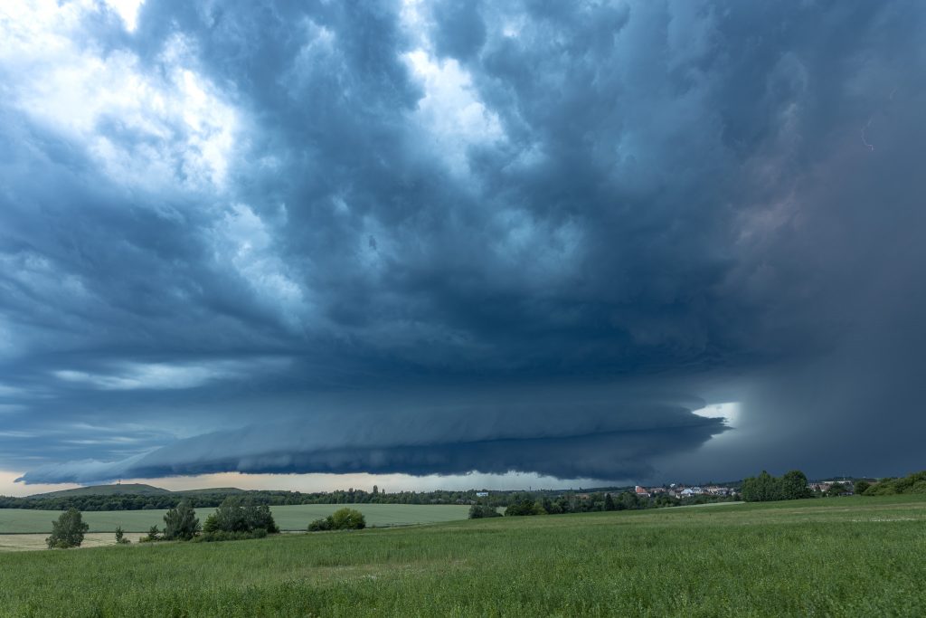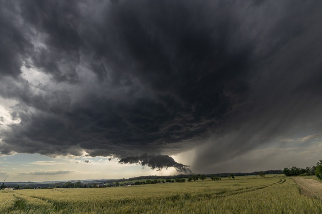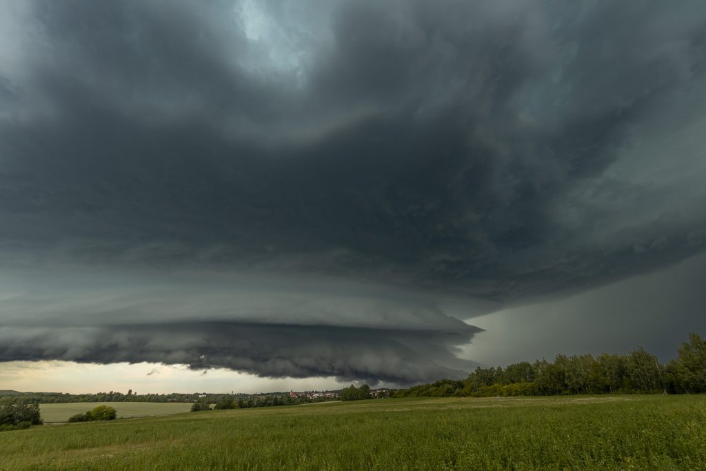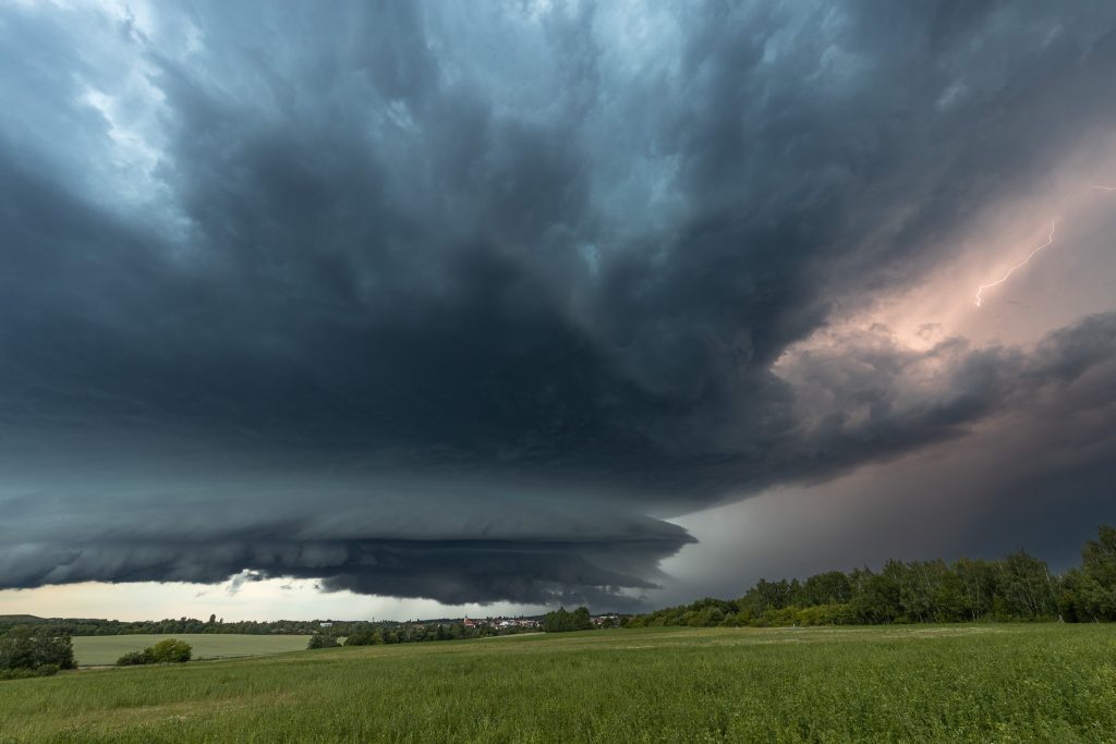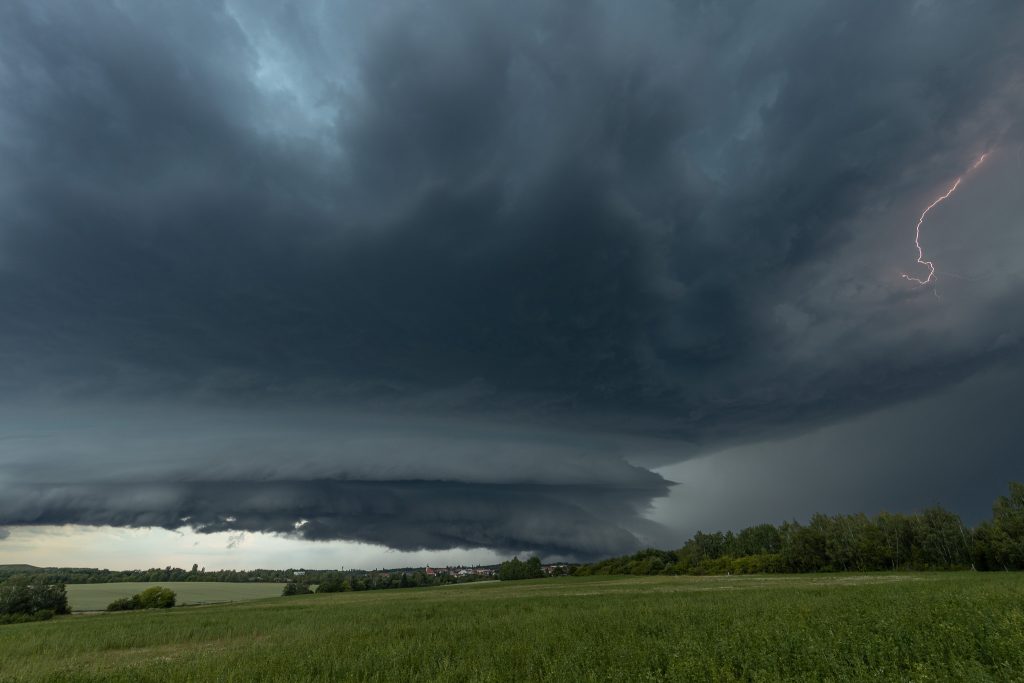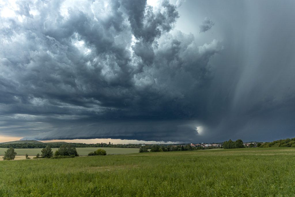 Nach diesen Aufnahmen ging es schnell weiter zurück auf die Autobahn und Richtung Osten. Beim Erreichen der Autobahn war die Böenfront schon über mir und man sah, wie der Niederschlagskern die hügeligen Wälder hinter mir bereits verschluckt hatte. Auf dem Weg nach Eisenach gab es vorweg überall Neuauslöse und es begann flächig zu regnen. Deshalb machte ich mir zu diesem Zeitpunkt keine Hoffnungen mehr, dass sich diese Zelle auf ihrem Weg in die Richtung der Neuauslöse noch weiter durchsetzen kann. Bis Erfurt stand ich dann wieder im Trockenen und hatte, wie fast schon zu erwarten, eine eher unstrukturierte Linie, die am Auslaufen war. Bei meinen Teamkollegen die in Nordsachsen verteilt warteten und mir machte sich langsam Frustration breit, da es zu diesem Zeitpunkt wieder einmal nach einem Flopp unter vermeintlich gutem Setup aussah. Ganz zu schweigen von der langen Anfahrt, Spritgeld usw.. Genau in diesen Minuten entwickelte sich jedoch bei Bad Kissingen an der Rhön eher unscheinbar binnen weniger Minuten eine starke Superzelle, welche munter Richtung Sachsen (Raum Plauen, Schleiz) losmarschierte. Auch ein deutlicher Hageltrack zog die Zelle. Da vorerst nicht von Abschwächung der Zelle auszugehen war, fuhr ich im Eiltempo über Jena in Richtung Schleiz. Knapp nördlich bog ich ab in Richtung Plauen und fand einen guten exponierten Standort, von wo aus ich die Superzelle schön auf mich zukreiseln lassen konnte. Die Charakteristika deuteten ganz klar auf eine LP- Superzelle hin.