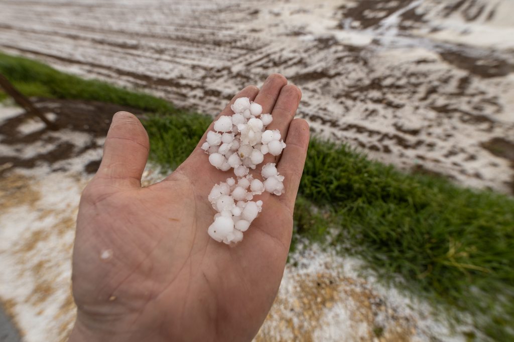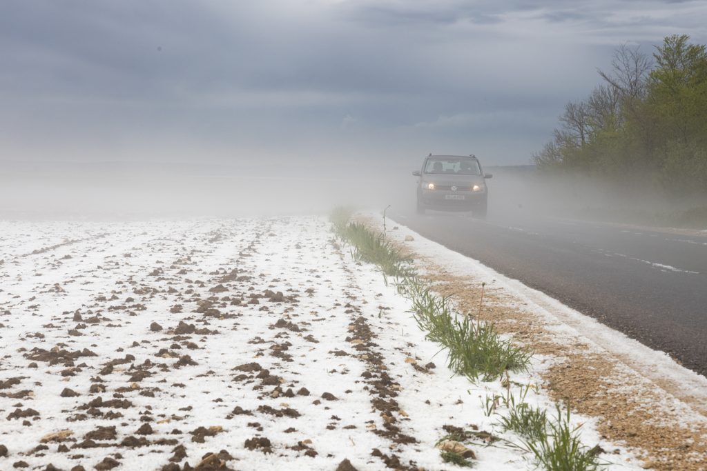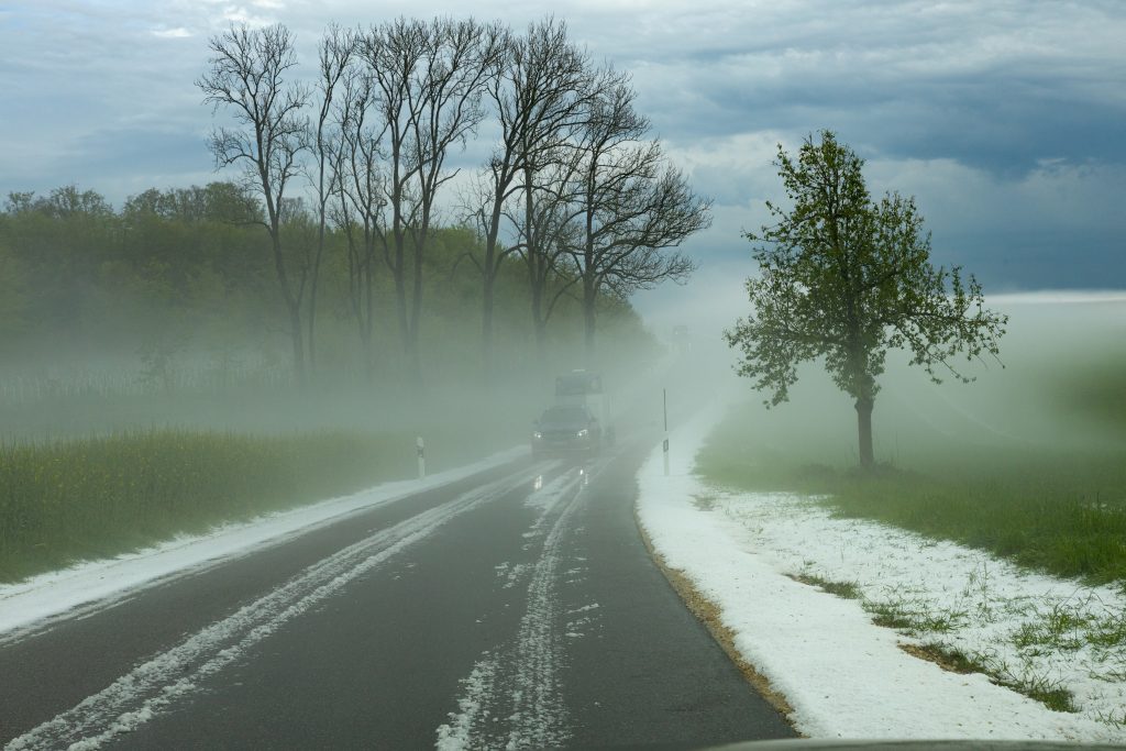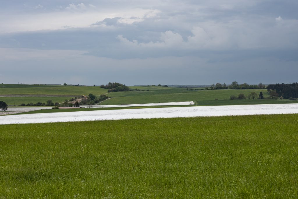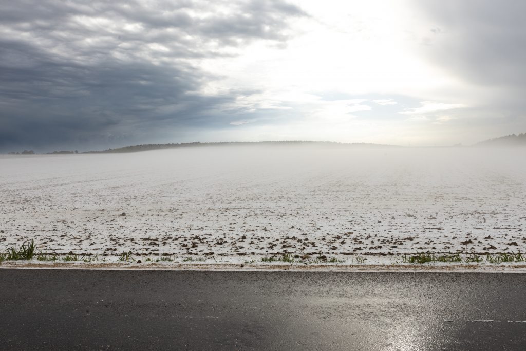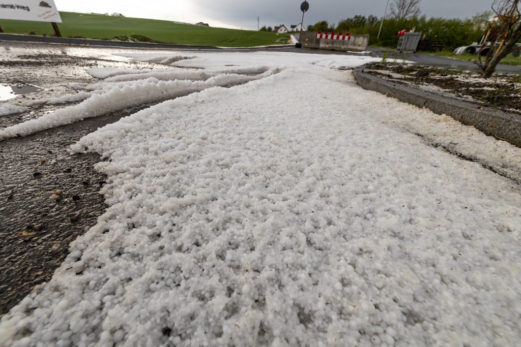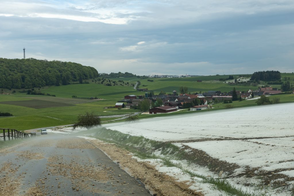 Nachdem sich der Aufwind komplett aufgelöst hatte fuhr ich nach Söhnstetten, wo laut Hagelanalyse der stärkste Teil niederging. Vor Ort fand ich große Mengen an kleinkörnigem Hagel bis 2,5 cm. Felder waren komplett weiß und einiges an Geröll und Schotter auf die Straßen gespült.