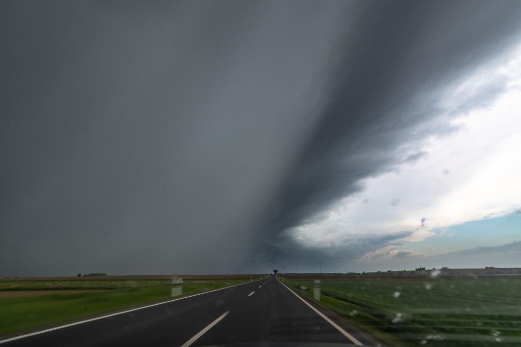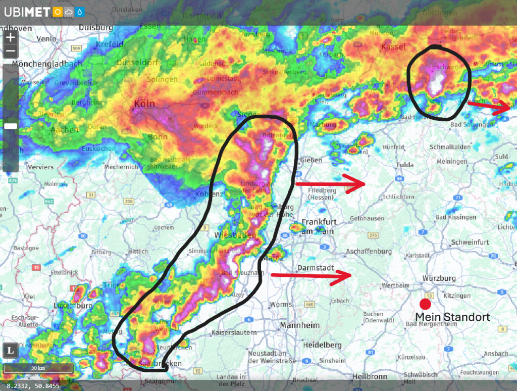 Ab diesem Zeitpunkt beschloss ich schnell abzubauen und aufzubrechen. Das war auch besser so denn keine 2 Minuten später war ich schon mitten im Downburst und versuchte mich wieder auf die Autobahn und weiter nach Schweinfurt vor die Front zu kämpfen.