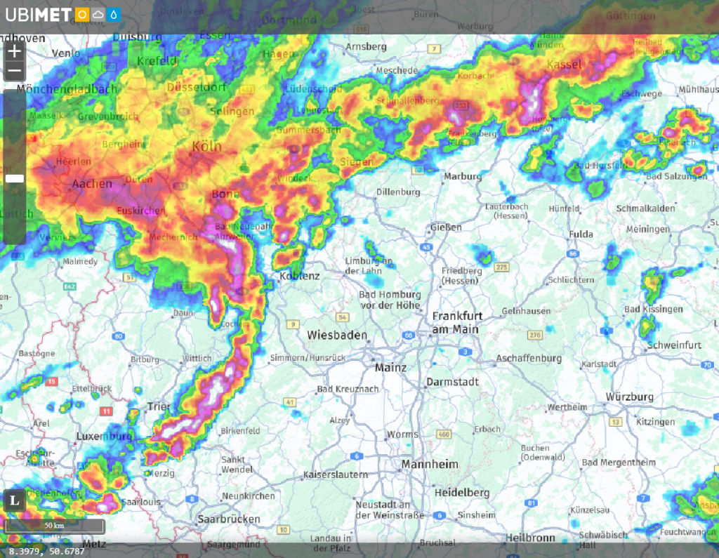 Die Radarsignatur der sich in RLP, Saarland und NRW verstärkenden Konvektion zeigte sehr markante Bereiche inklusive Bogenelementen und vereinzelt Hook-Echos. In Nordhessen schien sich ebenfalls eine sehr starke isoliertere Zelle zu entwickeln.