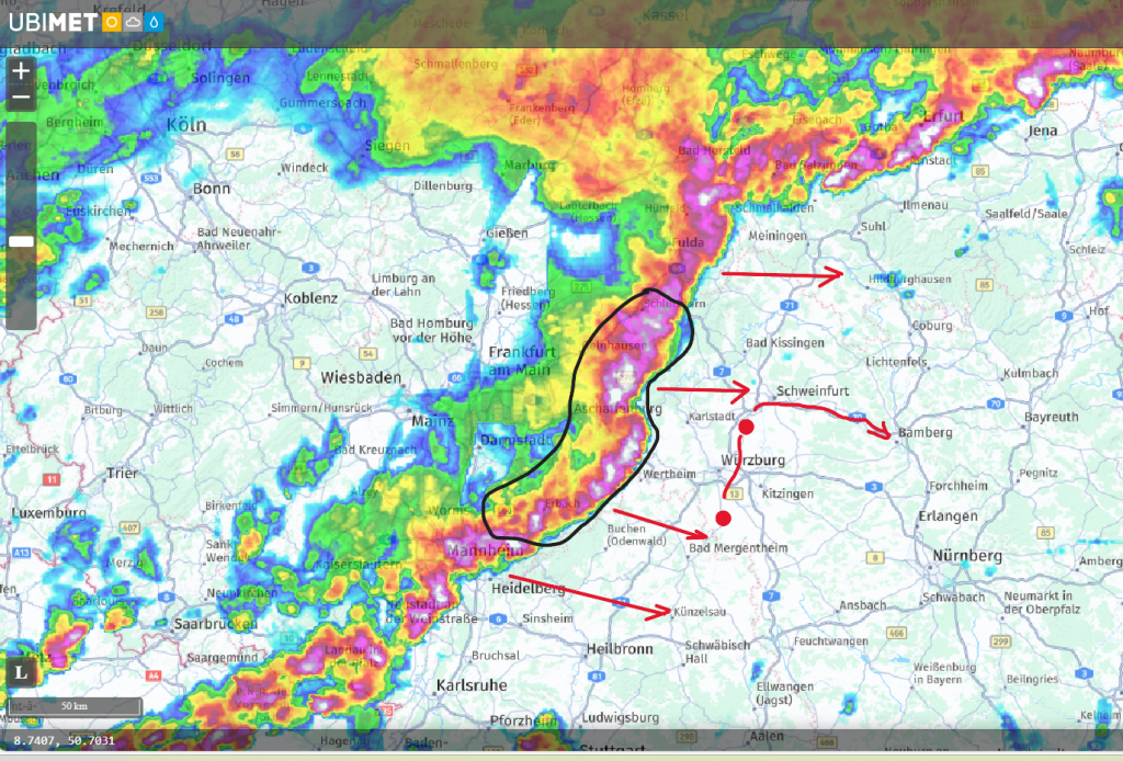 Etwas gesundheitlich angeschlagen aber dennoch motiviert ging es am späten Nachmittag in Richtung Würzburg, da von dort im Abendverlauf eine kräftige Gewitterlinie modelliert wurde. Diese sollte im Vorfeld einer Kaltfront mit guten Scherungsparametern auch für besser organisierte Gewittersegmente (Squall-Linie, einzelne Mesozyklonen nicht ausgeschlossen) reichen. Von Nordfrankreich & Belgien & Luxemburg aus entwickelten sich am Hebungsfeld einer Kurzwelle mehrere Segmente rasant und sorgten bei Trier durch ordentlich Sturm und Hagel für starke Schäden.