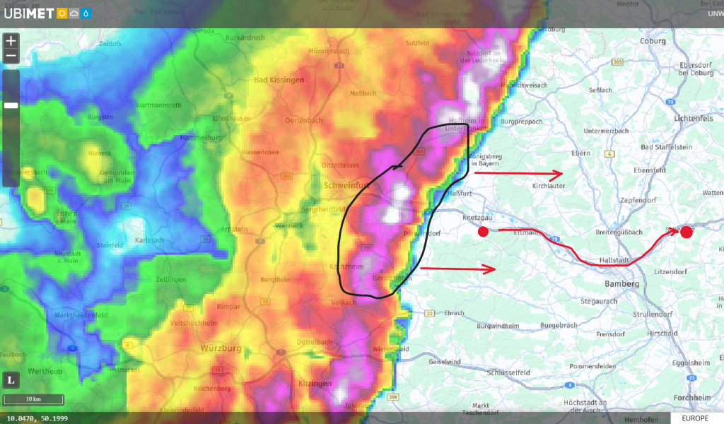 Bei Knetzgau direkt an der A70 hatte ich dann nach einer Hetzfahrt mit knappen 200km/h wieder etwas Vorsprung zur Front aufgebaut und konnte dort dann die nun viel besser strukturierte Front abfangen. Auch hier war nicht viel Zeit denn nach knappen 2-3 Minuten hatte mich der Niederschlag schon wieder eingeholt.