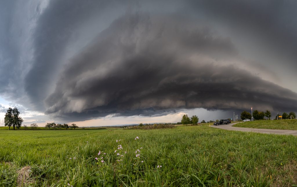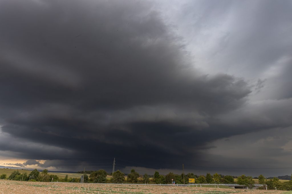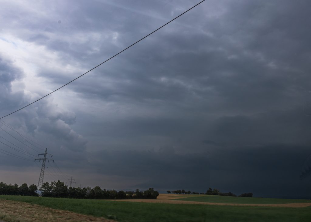 Kurz nach der A81 südlich von Seebronn fand ich eine freie Fläche um die von Hechingen aufziehende Zelle zu beobachten. Besonders auffallend waren die ins Zentrum gerichteten Inflowbänder. Ein weiteres Indiz dafür, dass sich die Zelle eher noch verstärkt.