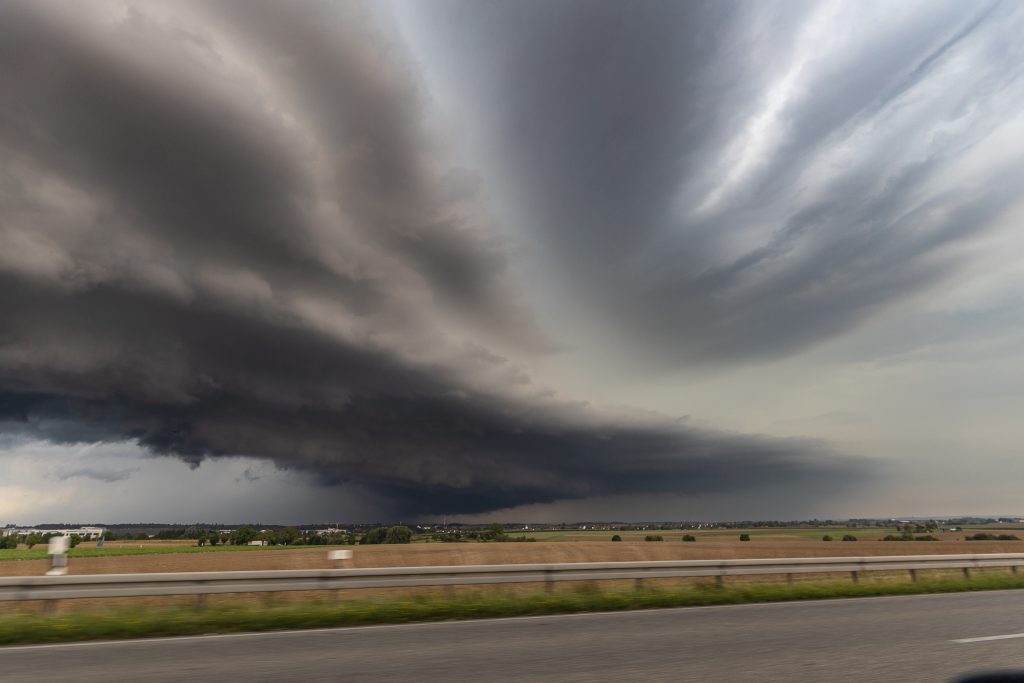 Kurz vor Freudenstadt bei Schopfloch hieß es dann erstmal abwarten auf erste Auslöse. Diese ließ auch nicht all zu lange auf sich warten und es ging klassisch an der Albkante zwischen Spaichingen und Balingen ein erster kräftiger Impuls hoch. Von weitem war bereits der Aufwind der Neuentwicklung zu erkennen und das davorliegende Windfeld sah meiner Einschätzung nach ganz passabel aus. Da sich die Zelle zwar von Radarloop zu Radarloop immer mehr verstärkte, aber zunächst kaum von der Stelle kam entschied ich mich frühzeitig wieder etwas in Richtung Neckar/A81 nach Seebronn zwischen Horb am Neckar und Rottenburg zu fahren. Schon auf dem Weg dort hin sah man wie kräftig und dominant die Entwicklung war. Neue Vorauslöse wurde von Norden durch den kräftigen Inflow direkt von der Hauptzelle eingesaugt und aus dem Dunst erkannte man langsam einen tiefer gehenden Arcus.