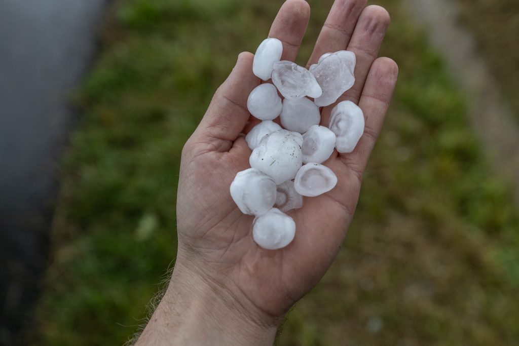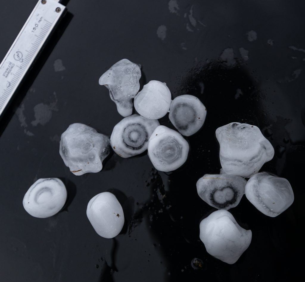 Es war interessant zu sehen wie unterschiedlich die Hagelschlossen ausgesehen haben. Dies liegt an den verschiedenen Prozessen, welche zu Hagelwachstum führen können. Manche Körner legen radial an Größe zu, indem sich immer wieder eine neue Wasserschicht um den Kondensationskeim anlagert und in größeren Höhen gefriert. Andere sogenannte Konglomerate entstehen durch das Kollidieren mehrerer kleiner Hagelkörner, welche durch den Wassereintrag in den unteren Aufwindbereichen in der Höhe zu größeren Klumpen gefrieren. Durch den guten Kontrast auf der schwarzen Motorhaube kann man diese Wachstumsarten gut erkennen und nachvollziehen. Besonders bei den radial gewachsenen Körnern kann man anhand der verschiedenen kreisförmigen Konturen erkennen, wie oft das Korn einen Zyklus durchlaufen hat. Klare Schichten sprechen für eine Phase, als das Korn durch eine sehr wasserhaltige Schicht im Aufwind/Abwind geschleudert wurde und die helleren/weißeren Anteile sind auf viele kleine Luftbläschen zurückzuführen. Hier war der Wassergehalt deutlich geringer und es kommt durch die Kollidierung verschiedener Körner, Wassertropfen (auch unterkühlt) zu diesen Lufteinschlüssen, die auf uns durch die Lichtstreuung weiß (allgemein heller) erscheinen.