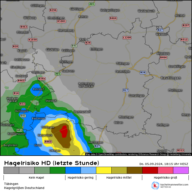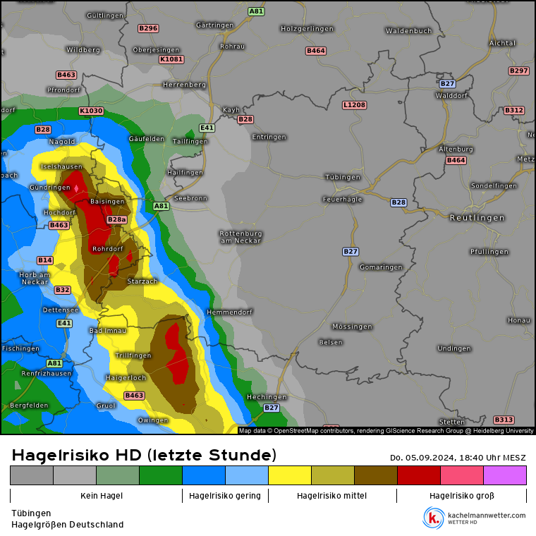 Zum Abschluss noch ein Radarbild zum Höhepunkt der Superzelle und der dazugehörige Hageltrack von kachelmannwetter.com. Dort erkennt man gut wie die Zelle genau bei Mötzingen den größten Hagel geschmissen hat.