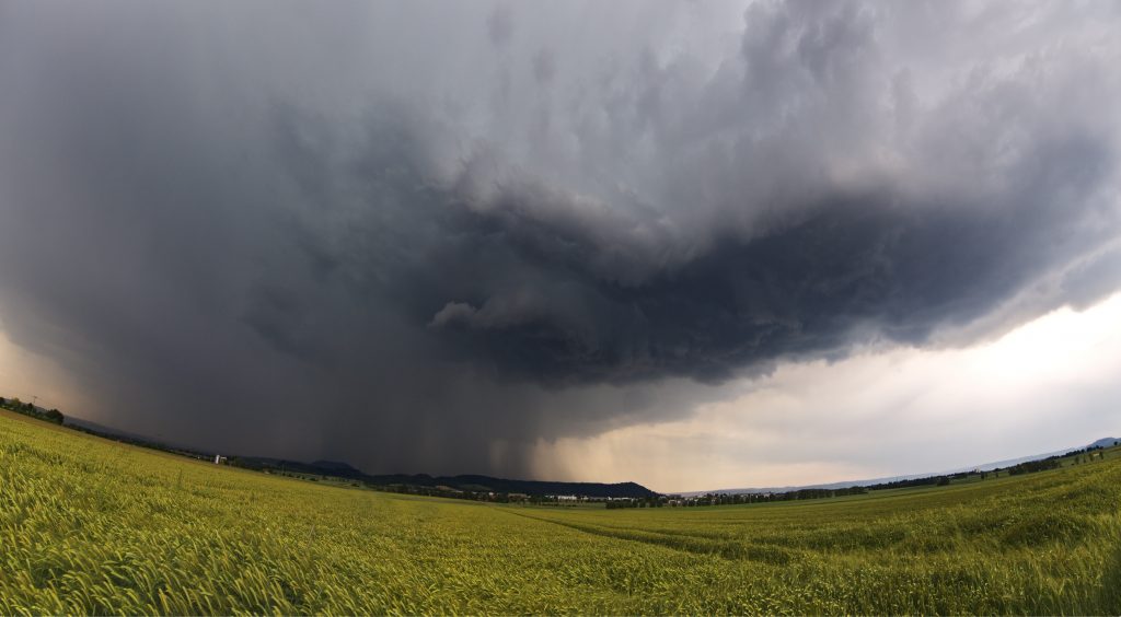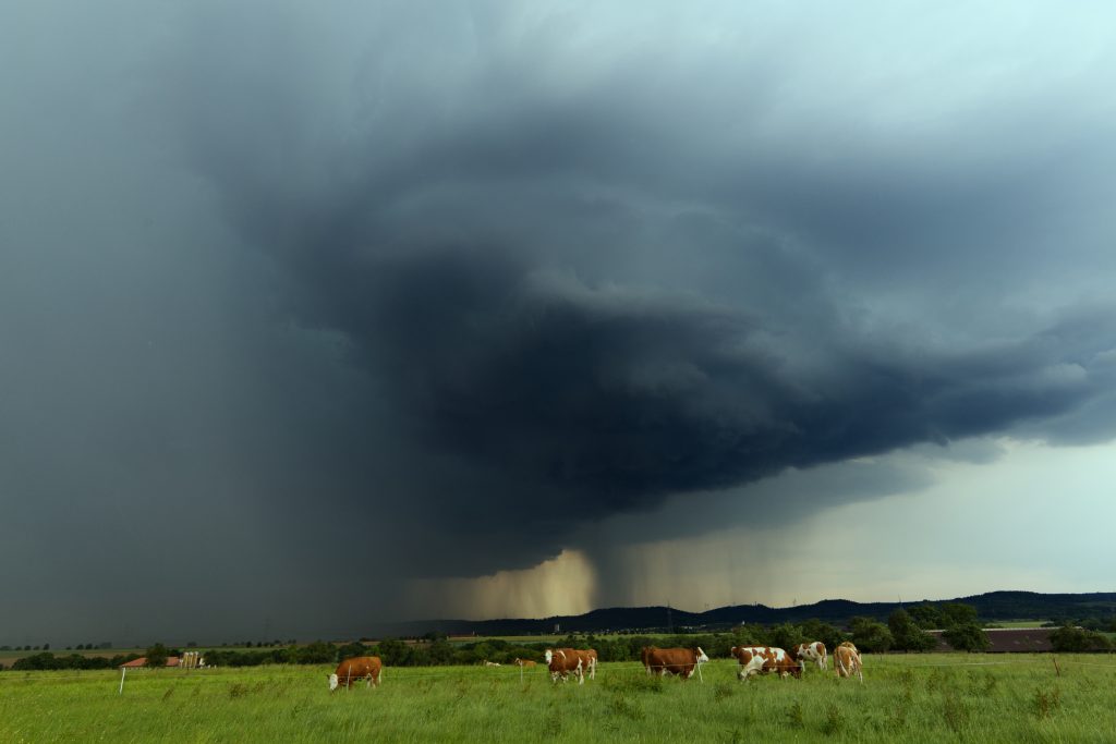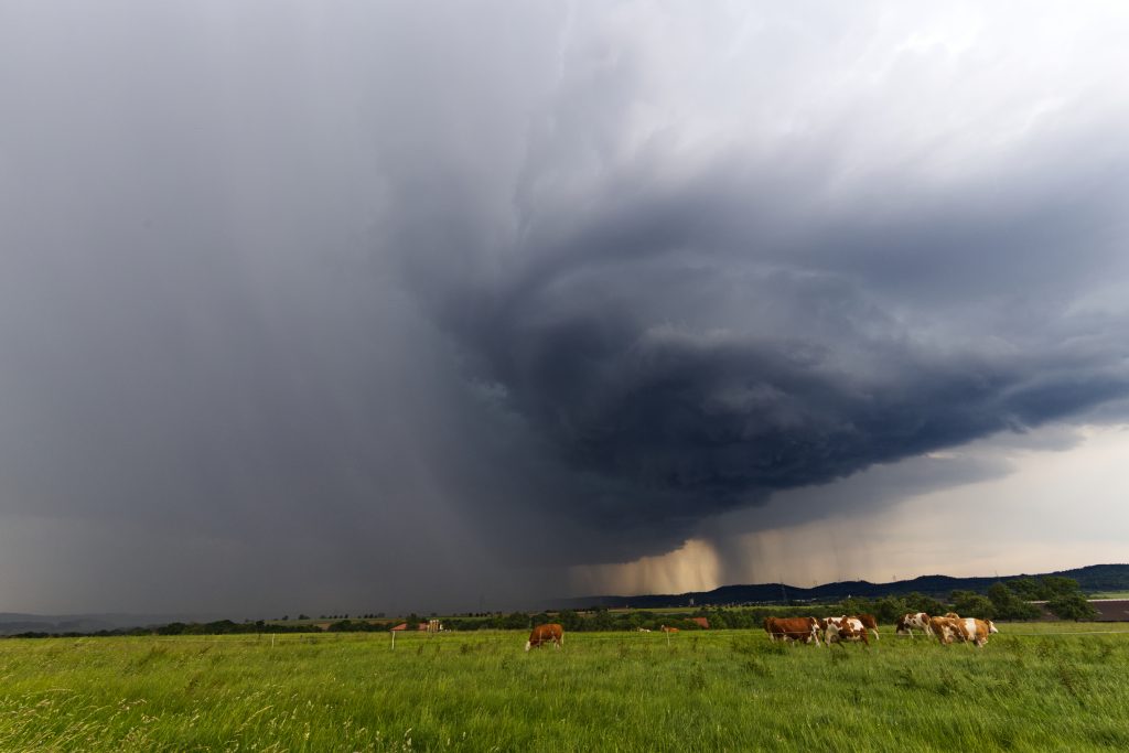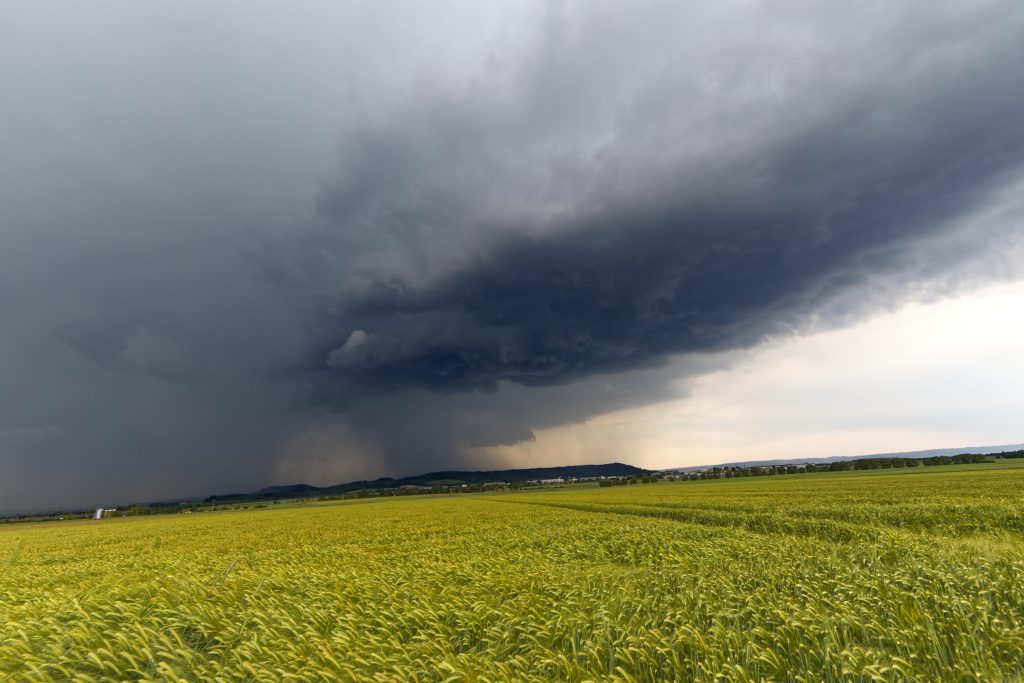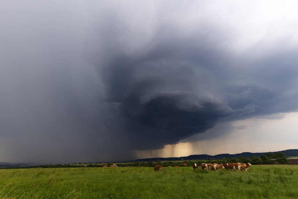 Das Zellsystem verstärkt sich rasch und bekommt einen immer stärker ausgeprägten Aufwind, welcher eingelagerte Rotation aufweist. Direkt daneben (links im Bild) ein starker Niederschlags-/Hagelkern der den Abwind des Systems darstellt. Kurze Zeit nach diesen Aufnahmen kommen an meinem Standort erste Hagelsteine bis 2 cm trocken herunter und nur 1 Minute später intensivierte sich der Hagelschlag deutlich und es waren zum Teil Brocken mit über 3cm dabei.