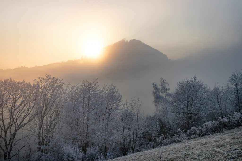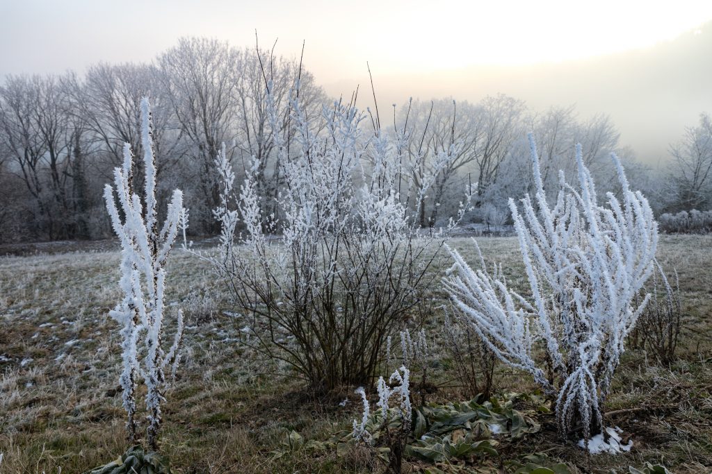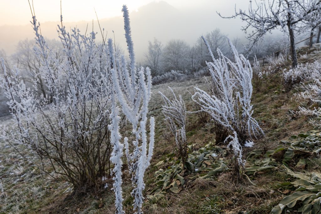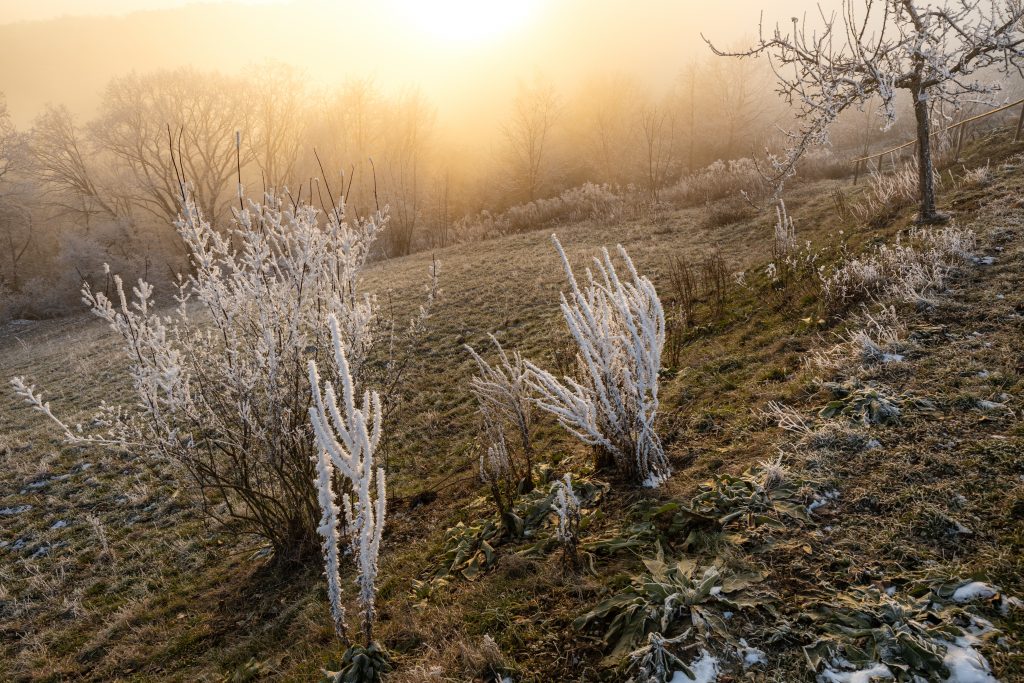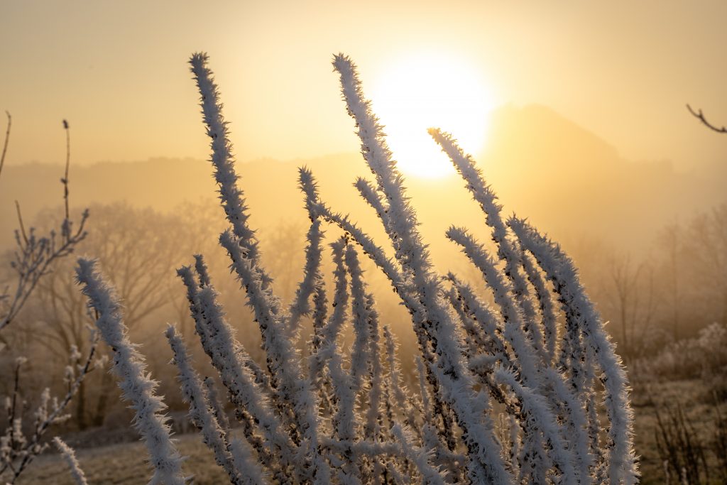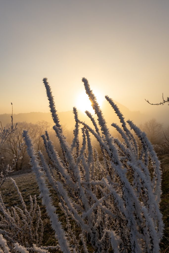 Am 12. Januar konnte ich nachmittags diese tolle Stimmung am Hang des Hohenstaufens an der Alb festhalten. Die Vegetation hatte eisige Stacheln angesetzt, welche durch das Überströmen vom Nebel bei ca. -5 bis -8 Grad Lufttemperatur über dem Boden stetig anbauten und gleichzeitig tauchte die untergehende Sonne die Landschaft ihn ein goldenes Licht.