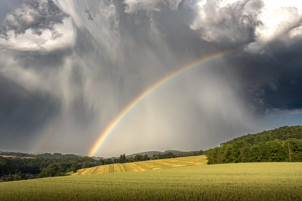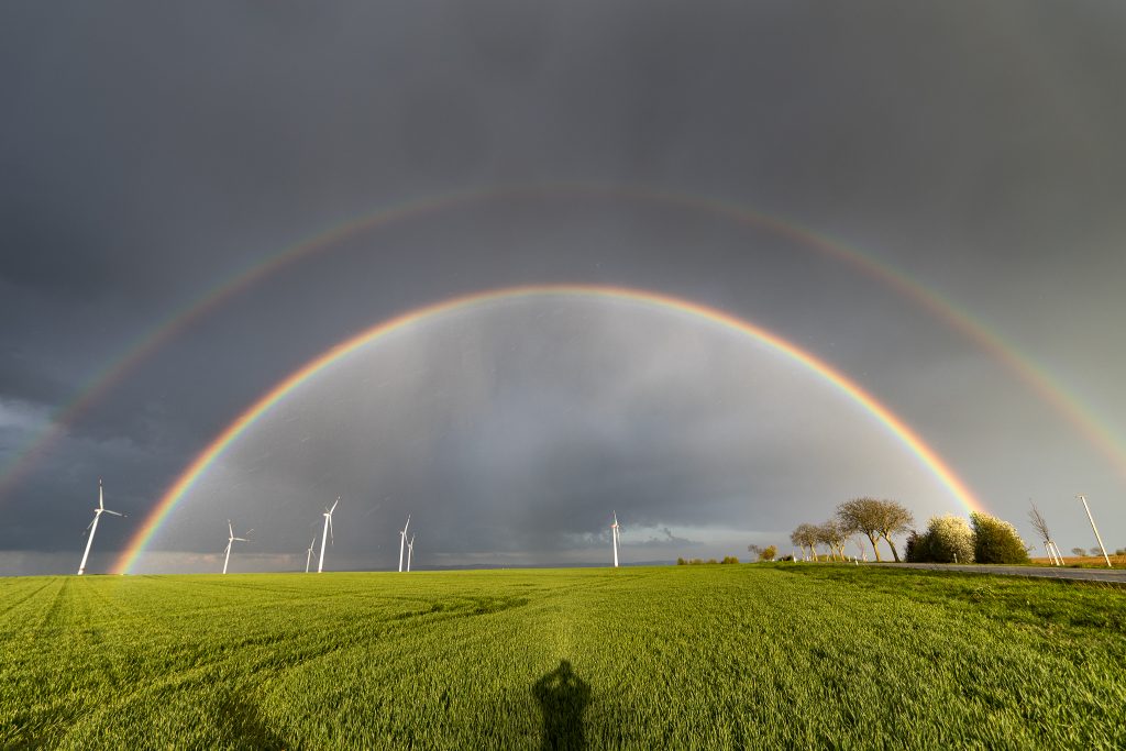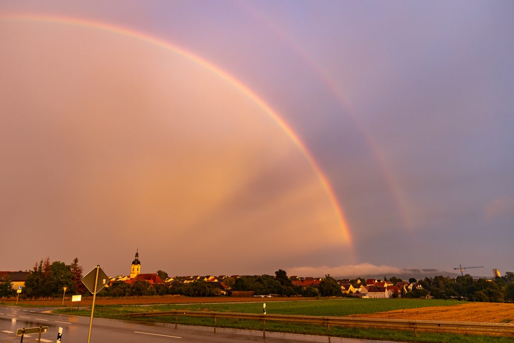 Hier ein ebenfalls doppelter Regenbogen, aber mit dem optischen Effekt der Interferenz, sowohl an Haupt- und Nebenbogen. Anders als beim normalen Regenbogen entsteht dieser Effekt durch die Lichtbeugung im optischen Medium. Durch die Interferenz wiederholt sich der Farbverlauf in abschwächender Form im Hauptbogen nach Innen und im Nebenbogen umgekehrt. Interferenzbögen entstehen nur bei besonders kleinen Regentropfen unter 0,5mm.