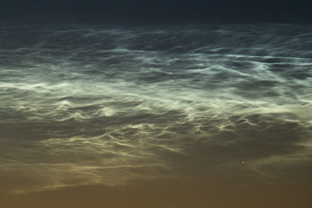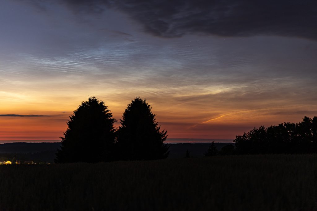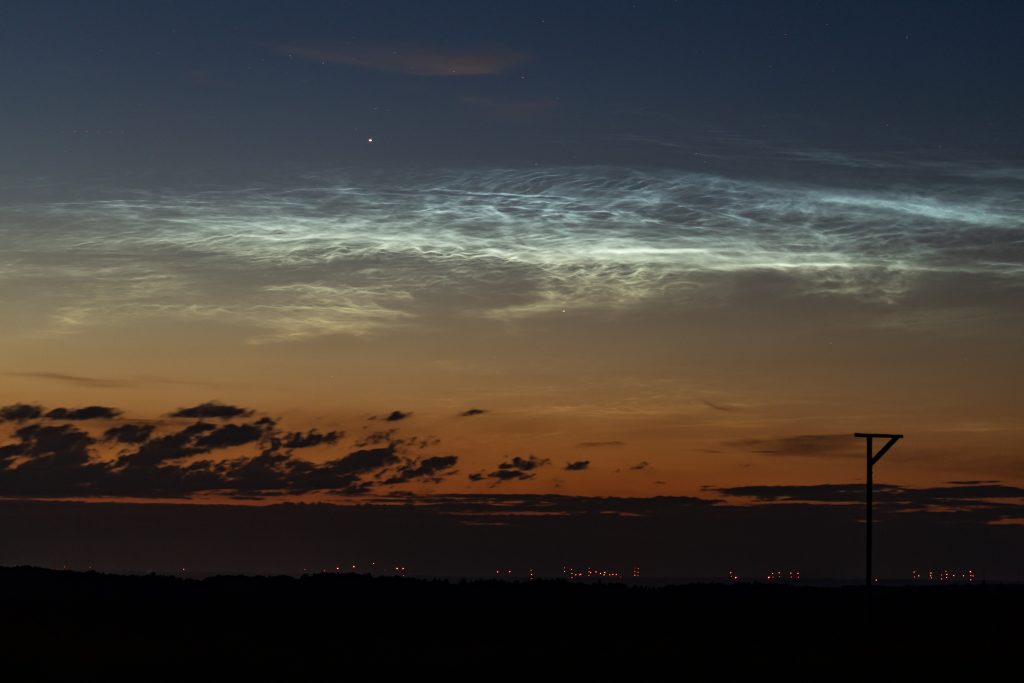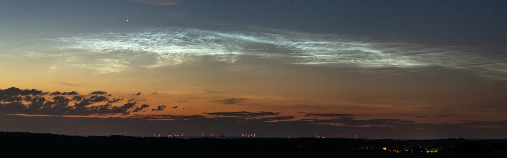 Bekannt unter der Bezeichnung „Leuchtende Nachtwolken“ handelt es sich hierbei um aus feinen Eiskristallen bestehende Eiswolken, welche in einer Höhe zwischen 81-87 km Höhe (etwa die Höhe der Mesopause) auftreten. Dort herrschen Temperaturen im Sommer bis -150°C. Diese eisigen Temperaturen brauch es zur Wolkenbildung in dieser Höhe auch, da der Wasserdampfgehalt im Vergleich zur Troposphäre wesentlich niedriger ist. In unseren Breitengraden kann man diese Wolken fast ausschließlich von Ende Mai bis Mitte Juli, immer 1-2 Stunden vor/nach Sonnenaufgang bestaunen. Das liegt daran, weil die Sonne durch die Erdkrümmung diese sehr hoch gelegenen Wolken noch anstrahlt, während die tieferen Wolken in der Troposphäre schon längst in den Erdschatten eingetreten sind.