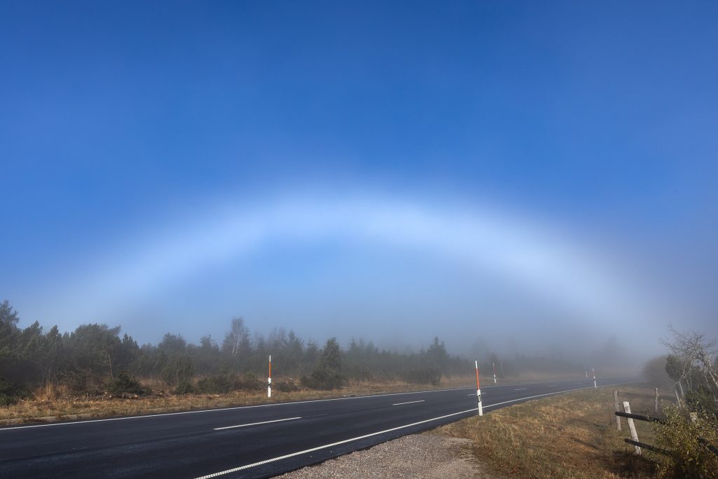 Ein Nebelbogen entsteht ebenfalls durch Die Brechung des Sonnenlichts an Tropfen. Diese sind bei Nebel aber um ein vielfaches kleiner, als zum Beispiel bei normalem stratiformen/konvektivem Regen. An diesem optisch sehr kleinen Streumedium wird das in Summe weiße Sonnenlicht nicht in seine Spektralfarben aufgespalten und der Nebelbogen erscheint daher auch weiß und nicht farbig wie ein klassischer Regenbogen. Antreffen kann man einen Nebelbogen im Übergangsbereich vom Nebel (wie hier auf dem Schliffkopf bei Inversion) zur klaren Luft.